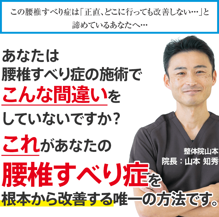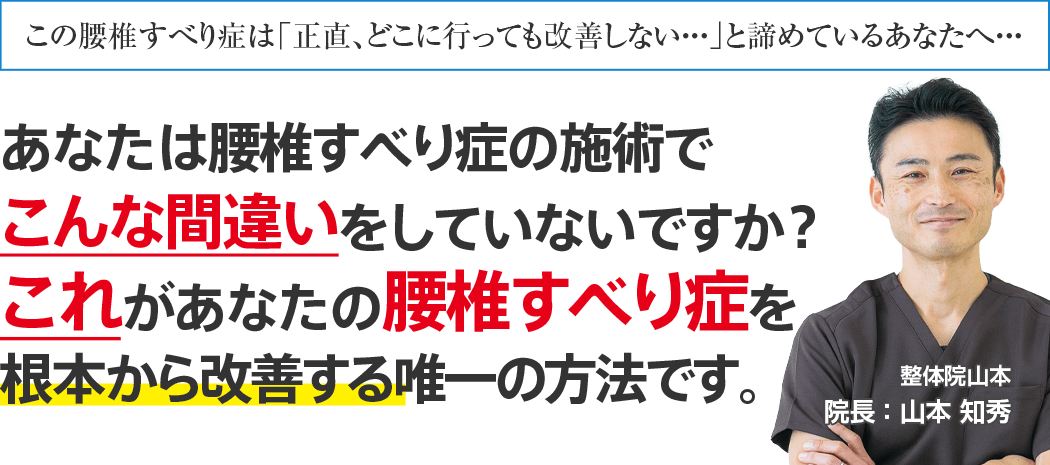 もし、あなたが今、上記のようなお悩みを抱えていて、それでも心のどこかで「本気で改善していきたい!」と思われているのであれば、整体院山本に来院し、あなたの慢性腰痛を根本的に改善し、その辛いお悩みを解決しませんか?