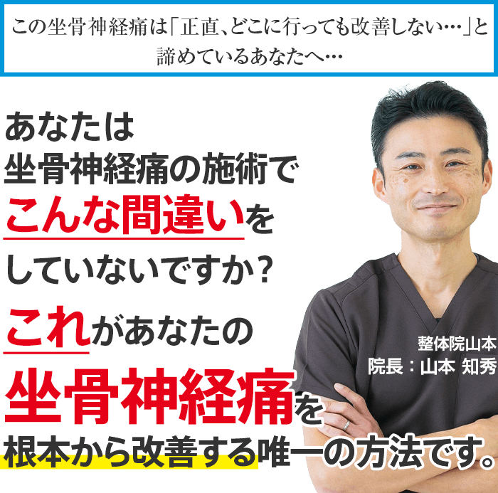 もし、あなたが今、上記のようなお悩みを抱えていて、それでも心のどこかで「本気で改善していきたい!」と思われているのであれば、整体院山本に来院し、あなたの慢性坐骨神経痛を根本的に改善し、その辛いお悩みを解決しませんか?